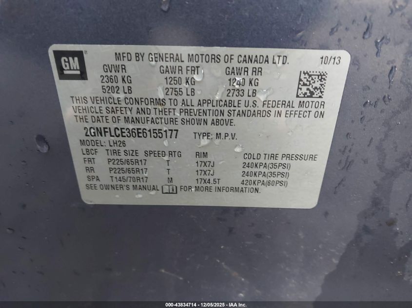 Колір СинійЦиліндри 6Привід Передній привідVIN 2GNFLCE36E6155177Стан Заводиться та їде (перевірено)Ушкодження Передня або задня AutoRIA