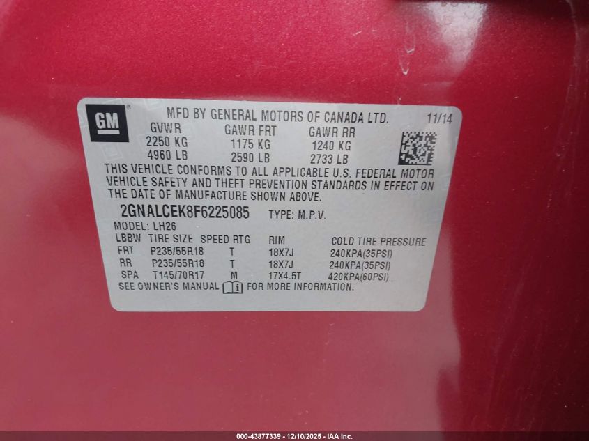 2015 CHEVROLET EQUINOX 2015 року Бензин, 2.4, Передній привід, vin - 2GNALCEK8F6225085 з США