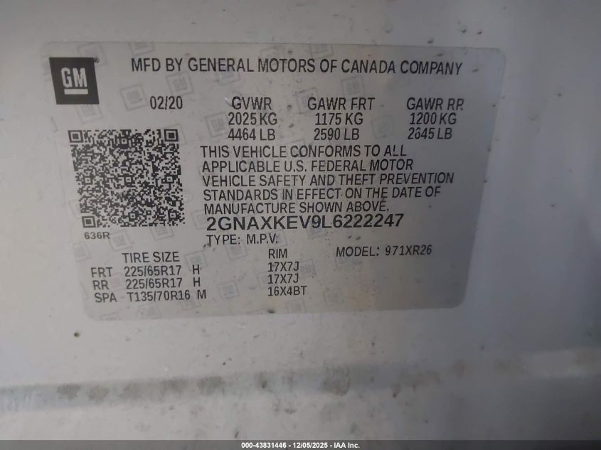 2020 CHEVROLET EQUINOX 2020 року Бензин, 1.5, Передній привід, vin - 2GNAXKEV9L6222247 з США