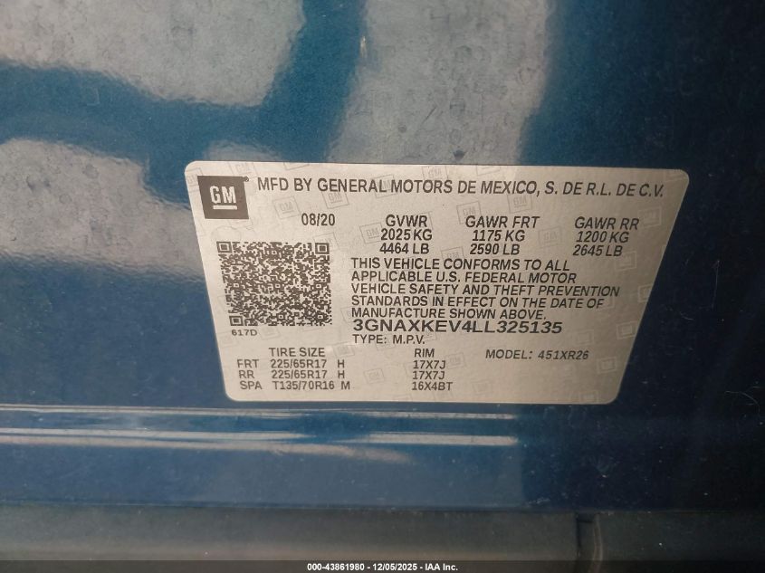 2020 CHEVROLET EQUINOX 2020 року Бензин, 1.5, Передній привід, vin - 3GNAXKEV4LL325135 з США