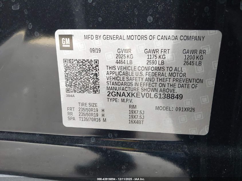 2020 CHEVROLET EQUINOX 2020 року Бензин, 1.5, Передній привід, vin - 2GNAXKEV0L6138849 з США