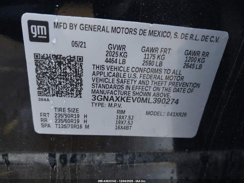 2021 CHEVROLET EQUINOX 2021 року Бензин, 1.5, Передній привід, vin - 3GNAXKEV0ML390274 з США