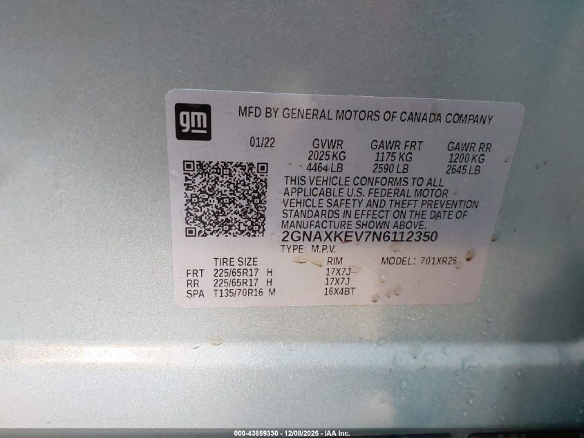 2022 CHEVROLET EQUINOX 2022 року Бензин, 1.5, Передній привід, vin - 2GNAXKEV7N6112350 з США