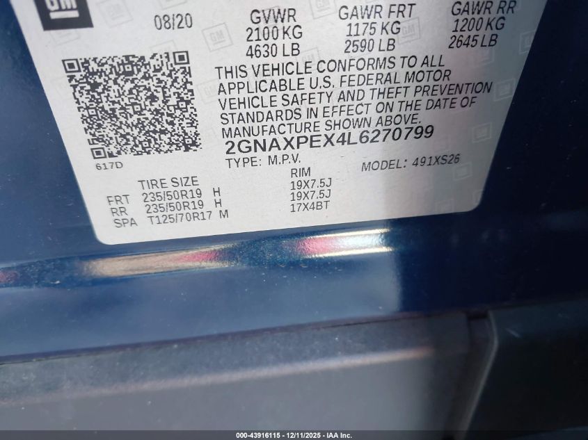 2020 CHEVROLET EQUINOX 2020 року Бензин, 2.0, Передній привід, vin - 2GNAXPEX4L6270799 з США