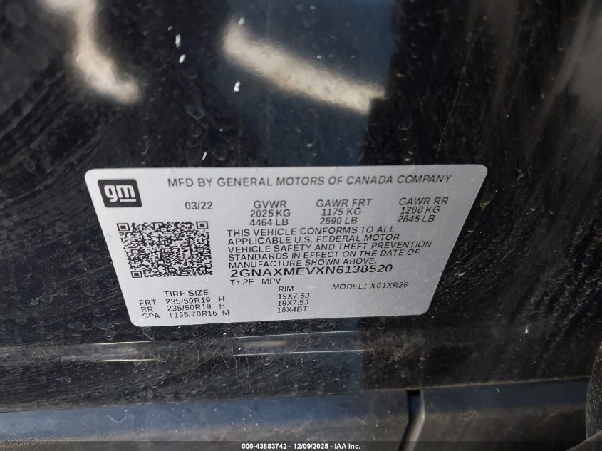2022 CHEVROLET EQUINOX 2022 року Бензин, 1.5, Передній привід, vin - 2GNAXMEVXN6138520 з США