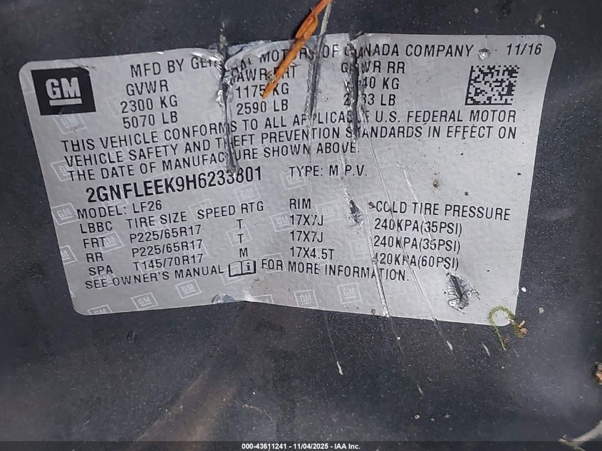2017 CHEVROLET EQUINOX 2017 року Бензин, 2.4, Повний привід, vin - 2GNFLEEK9H6233801 з США