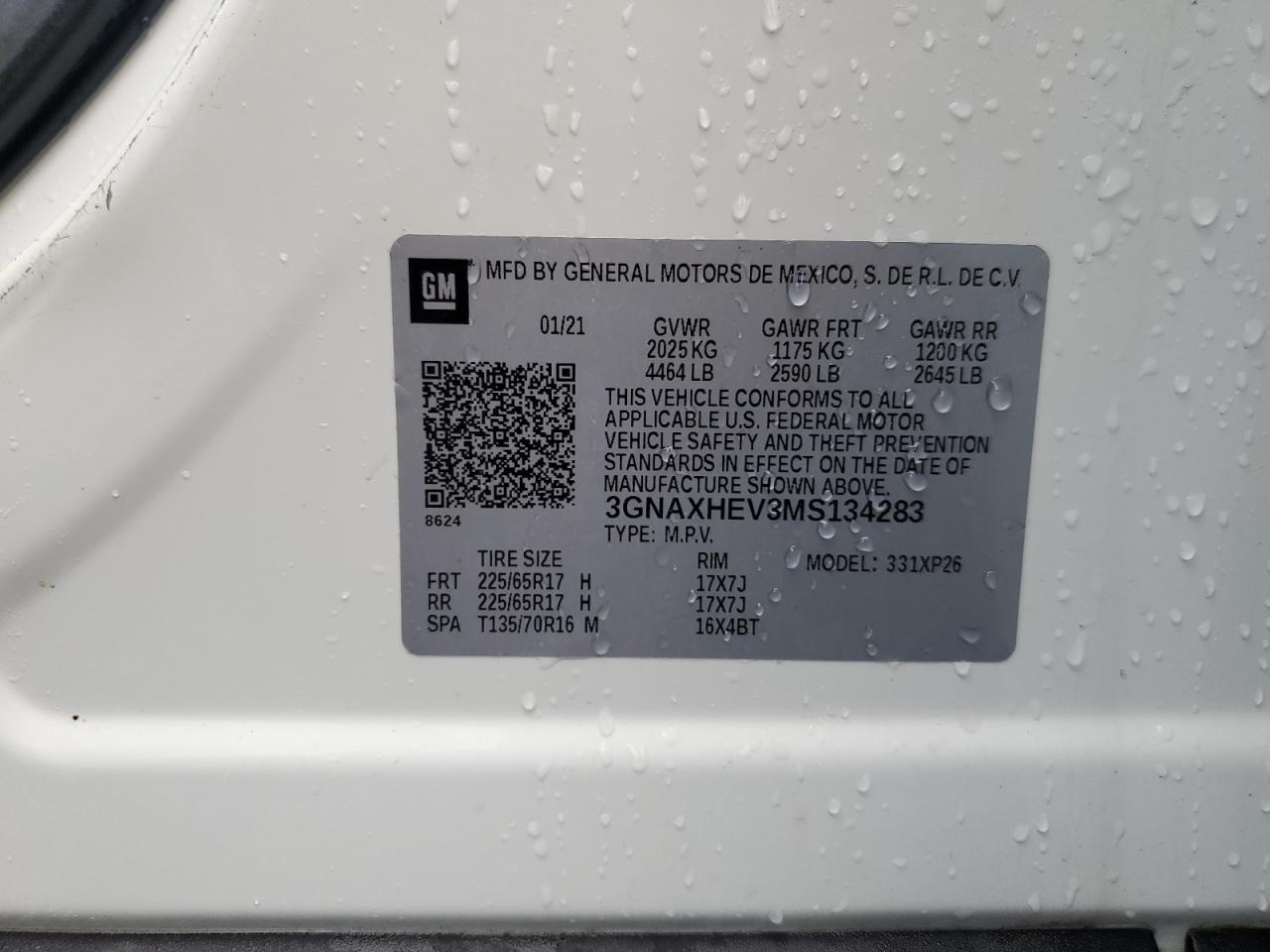 Колір БілийЦиліндри 4VIN 3GNAXHEV3MS134283Стан Заводиться та їде (перевірено)Ушкодження З боківДата аукціону 2025-12-09 AutoRIA