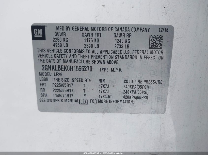 2017 CHEVROLET EQUINOX 2017 року Бензин, 2.4, Передній привід, vin - 2GNALBEK0H1556270 з США