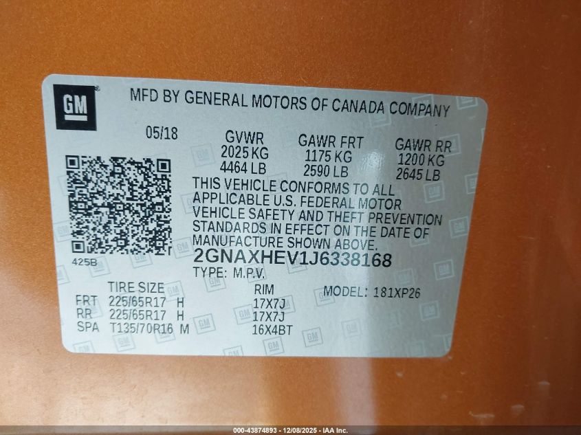 2018 CHEVROLET EQUINOX 2018 року Бензин, 1.5, Передній привід, vin - 2GNAXHEV1J6338168 з США