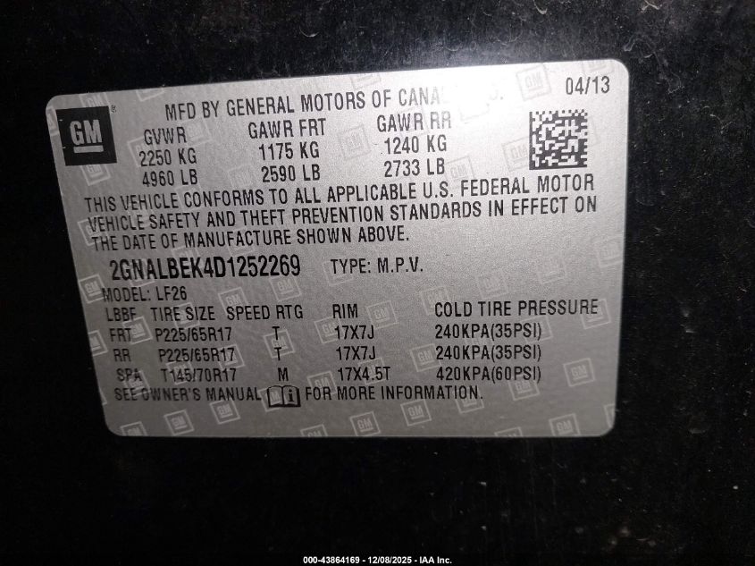 2013 CHEVROLET EQUINOX 2013 року Бензин, 2.4, Передній привід, vin - 2GNALBEK4D1252269 з США