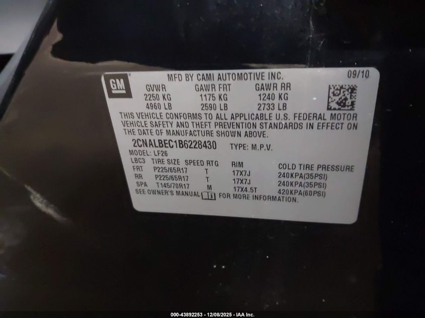 2011 CHEVROLET EQUINOX 2011 року Бензин, 2.4, Передній привід, vin - 2CNALBEC1B6228430 з США
