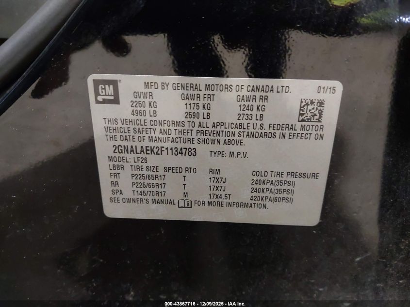 2015 CHEVROLET EQUINOX 2015 року Бензин, 2.4, Передній привід, vin - 2GNALAEK2F1134783 з США