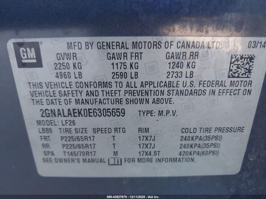 2014 CHEVROLET EQUINOX 2014 року Бензин, 2.4, Передній привід, vin - 2GNALAEK0E6305659 з США