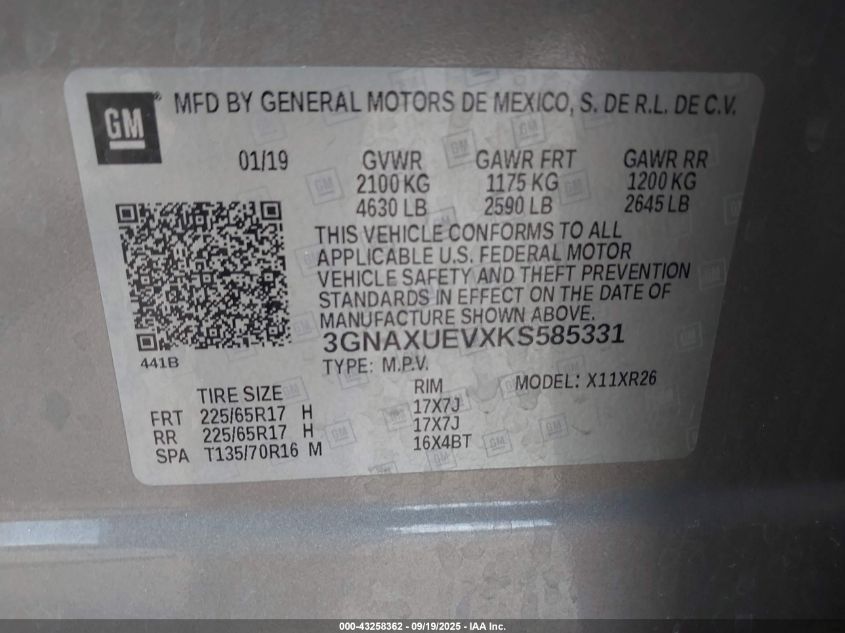 2019 CHEVROLET EQUINOX 2019 року Бензин, 1.5, Повний привід, vin - 3GNAXUEVXKS585331 з США