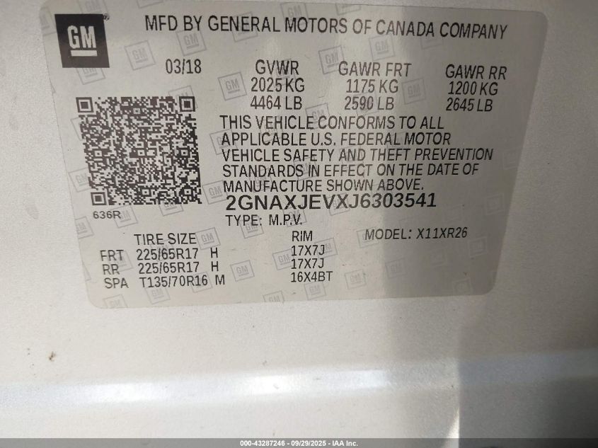 2018 CHEVROLET EQUINOX 2018 року Бензин, 1.5, Передній привід, vin - 2GNAXJEVXJ6303541 з США