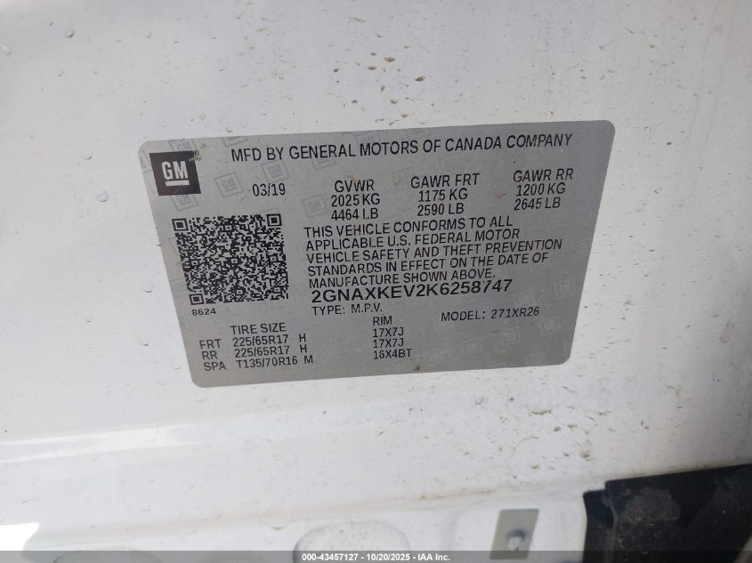 2019 CHEVROLET EQUINOX 2019 року Бензин, 1.5, Передній привід, vin - 2GNAXKEV2K6258747 з США