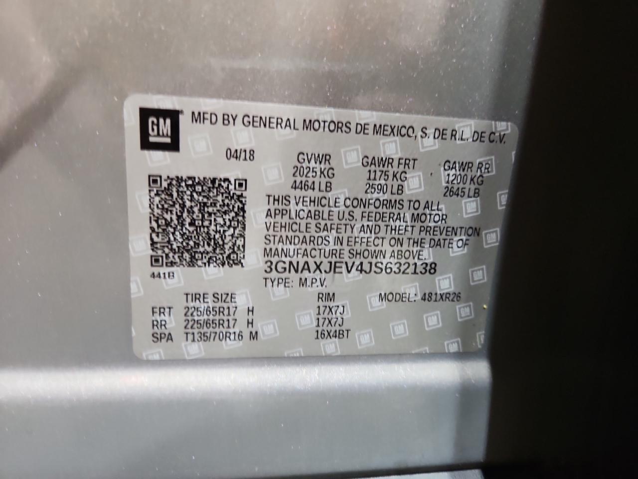 Колір СірийЦиліндри 4VIN 3GNAXJEV4JS632138Стан ЗаводитьсяУшкодження Передня або задня AutoRIA