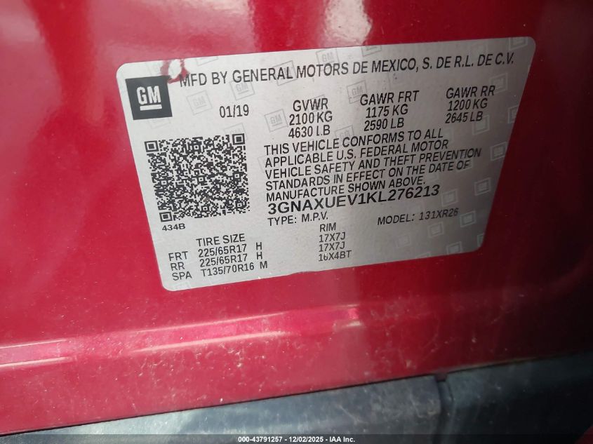 Колір ЧервонийЦиліндри 4Привід Повний привідVIN 3GNAXUEV1KL276213Стан СтаціонарноУшкодження Передня або задня AutoRIA