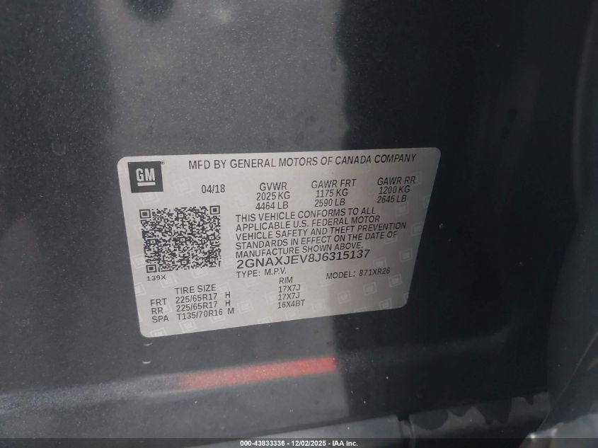 2018 CHEVROLET EQUINOX 2018 року Бензин, 1.5, Передній привід, vin - 2GNAXJEV8J6315137 з США