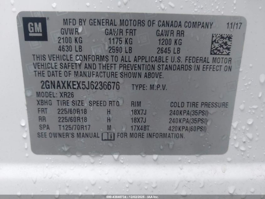 2018 CHEVROLET EQUINOX 2018 року Бензин, 2.0, Передній привід, vin - 2GNAXKEX5J6236676 з США
