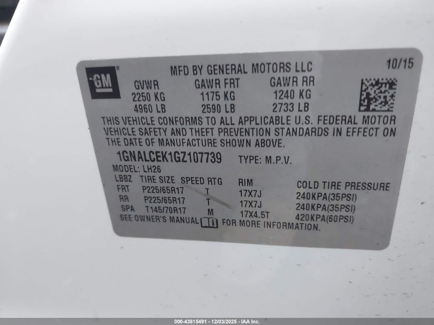 2016 CHEVROLET EQUINOX 2016 року Бензин, 2.4, Передній привід, vin - 1GNALCEK1GZ107739 з США