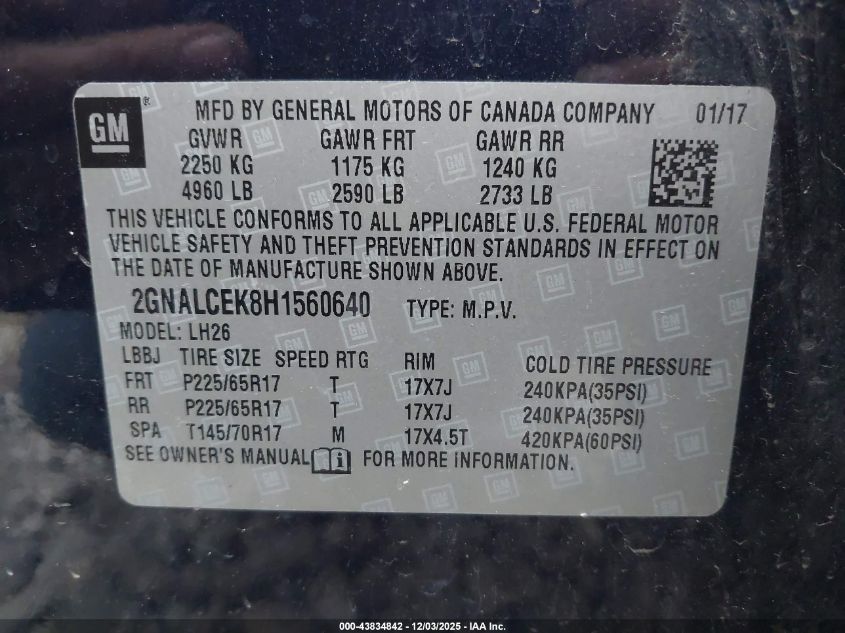 2017 CHEVROLET EQUINOX 2017 року Бензин, 2.4, Передній привід, vin - 2GNALCEK8H1560640 з США