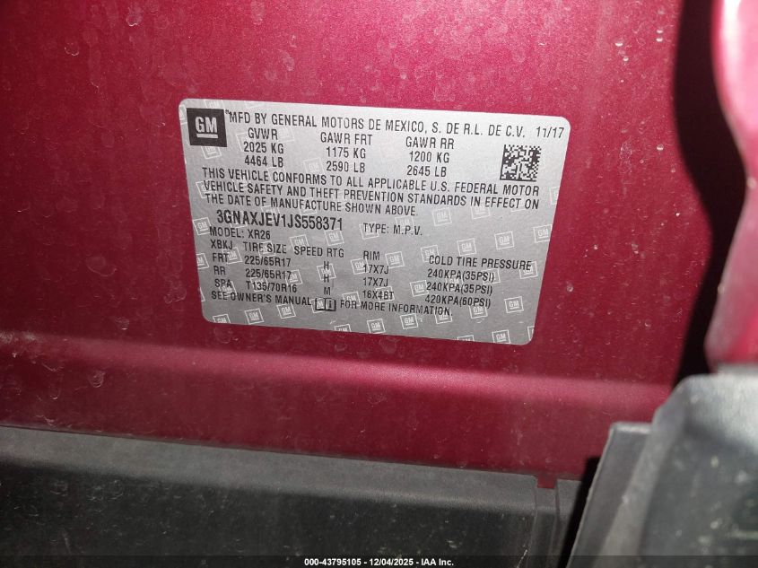 2018 CHEVROLET EQUINOX 2018 року Бензин, 1.5, Передній привід, vin - 3GNAXJEV1JS558371 з США
