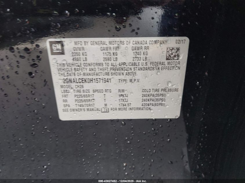 2017 CHEVROLET EQUINOX 2017 року Бензин, 2.4, Передній привід, vin - 2GNALCEK0H1571941 з США