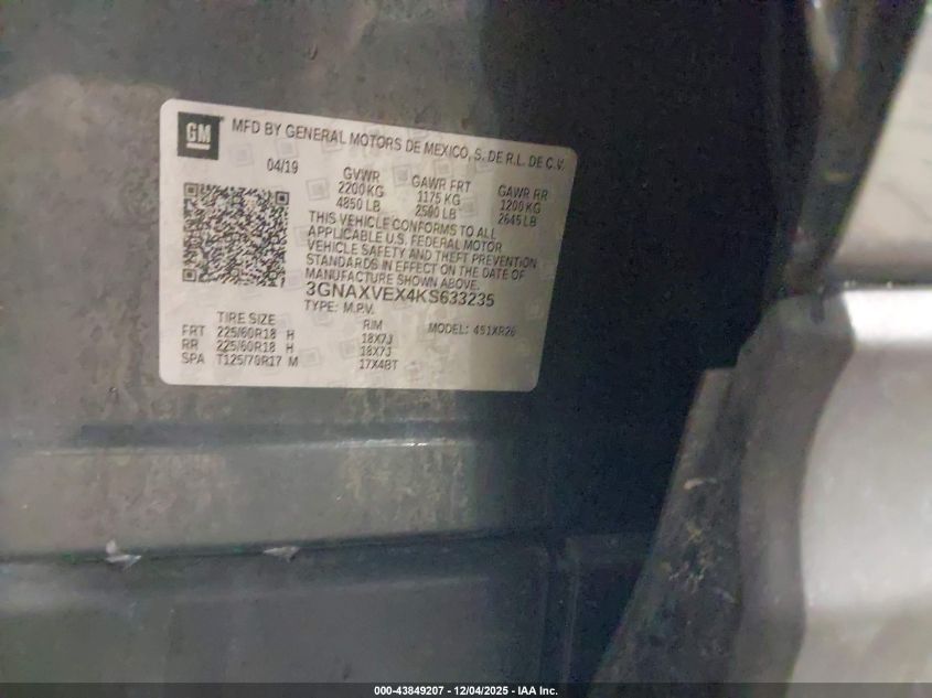 2019 CHEVROLET EQUINOX 2019 року Бензин, 2.0, Повний привід, vin - 3GNAXVEX4KS633235 з США