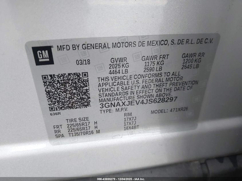 2018 CHEVROLET EQUINOX 2018 року Бензин, 1.5, Передній привід, vin - 3GNAXJEV4JS628297 з США