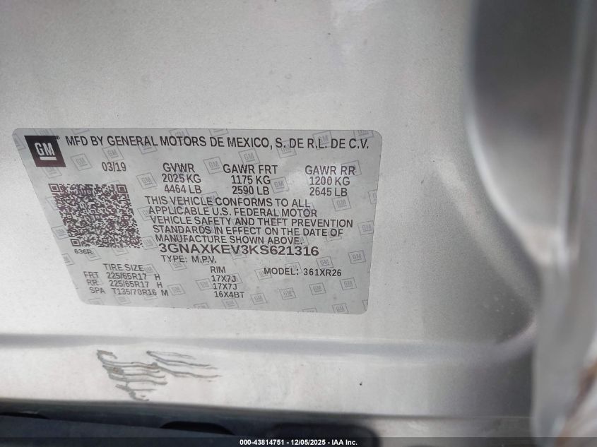 2019 CHEVROLET EQUINOX 2019 року Бензин, 1.5, Передній привід, vin - 3GNAXKEV3KS621316 з США