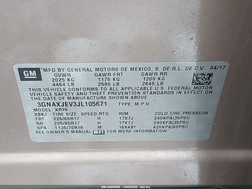 Колір КоричневийЦиліндри 4Привід Передній привідVIN 3GNAXJEV3JL105671Стан Заводиться та їде (перевірено)Ушкодження Передня або задня AutoRIA