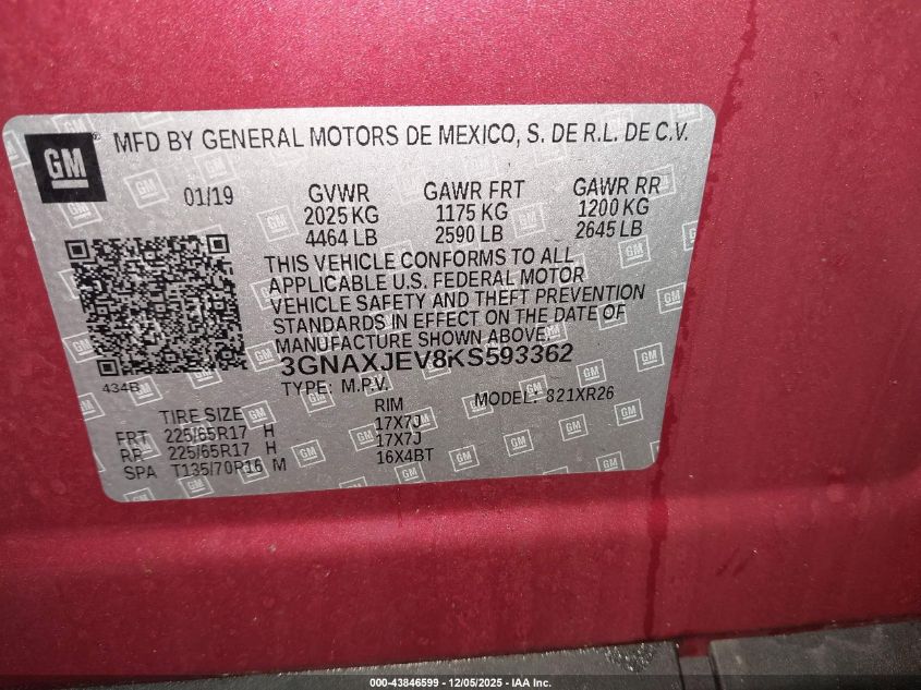 2019 CHEVROLET EQUINOX 2019 року Бензин, 1.5, Передній привід, vin - 3GNAXJEV8KS593362 з США