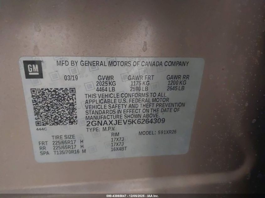 2019 CHEVROLET EQUINOX 2019 року Бензин, 1.5, Передній привід, vin - 2GNAXJEV5K6264309 з США