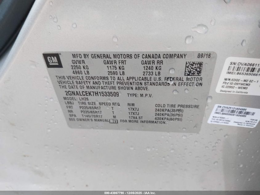 2017 CHEVROLET EQUINOX 2017 року Бензин, 2.4, Передній привід, vin - 2GNALCEK7H1533509 з США