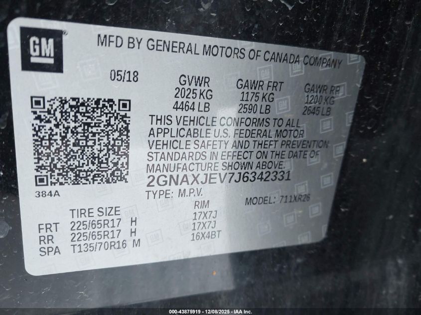 Колір ЧорнийЦиліндри 4Привід Передній привідVIN 2GNAXJEV7J6342331Стан Заводиться та їде (перевірено)Ушкодження Передня або задня AutoRIA
