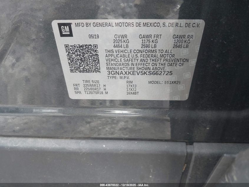 2019 CHEVROLET EQUINOX 2019 року Бензин, 1.5, Передній привід, vin - 3GNAXKEV5KS662725 з США