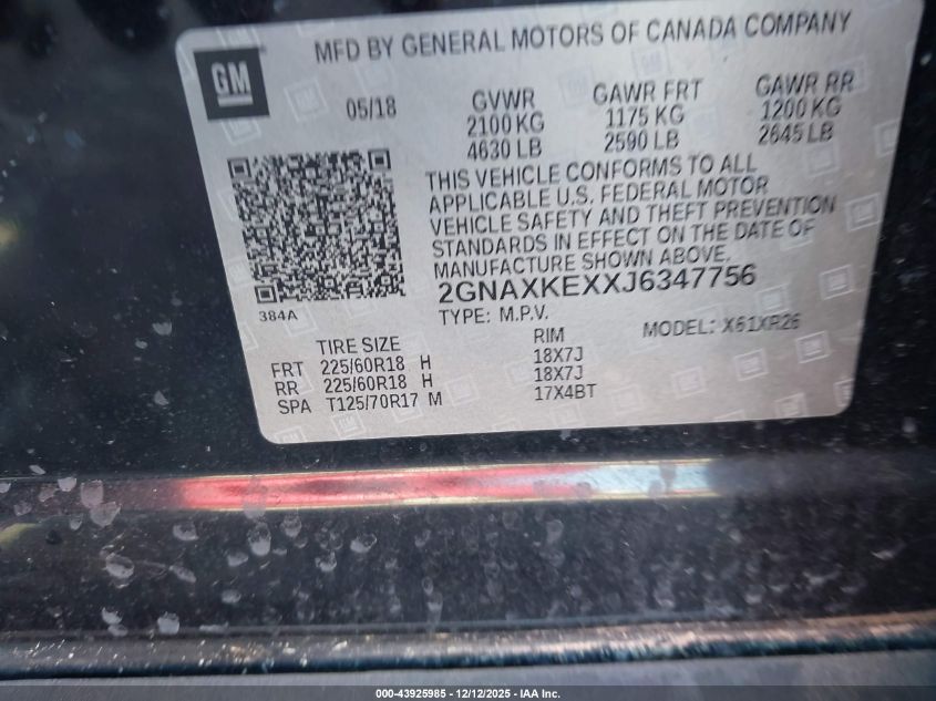 2018 CHEVROLET EQUINOX 2018 року Бензин, 2.0, Передній привід, vin - 2GNAXKEXXJ6347756 з США