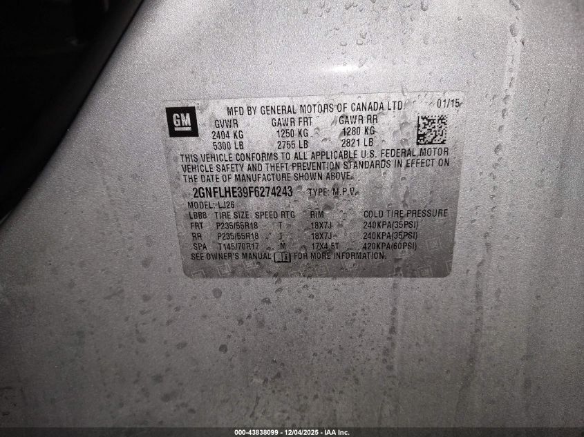 Колір СрібнийЦиліндри 6Привід Повний привідVIN 2GNFLHE39F6274243Стан Заводиться та їде (перевірено)Ушкодження Передня ліва AutoRIA