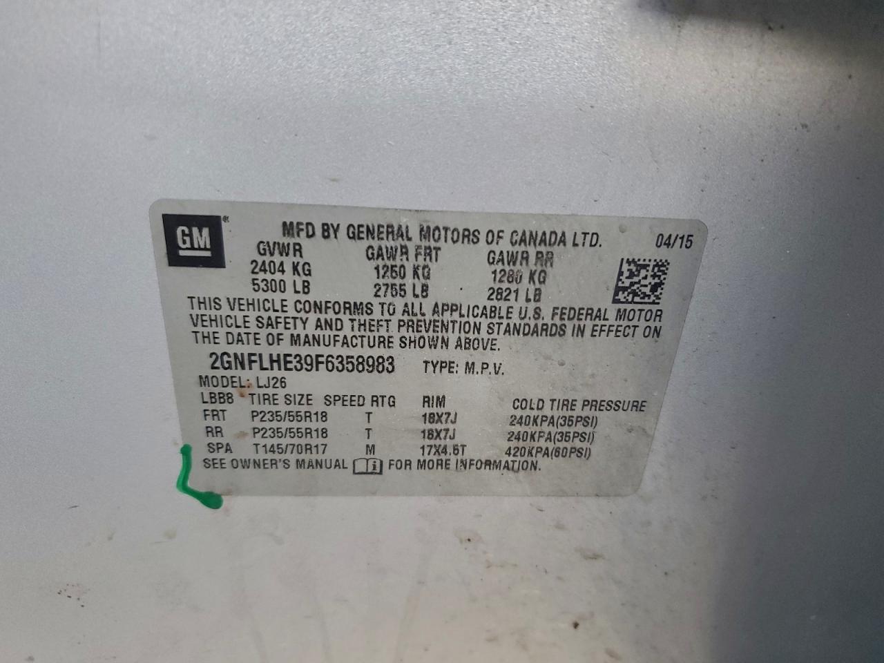 2015 CHEVROLET EQUINOX 2015 року Бензин, 3.6, Повний привід, vin - 2GNFLHE39F6358983 з США