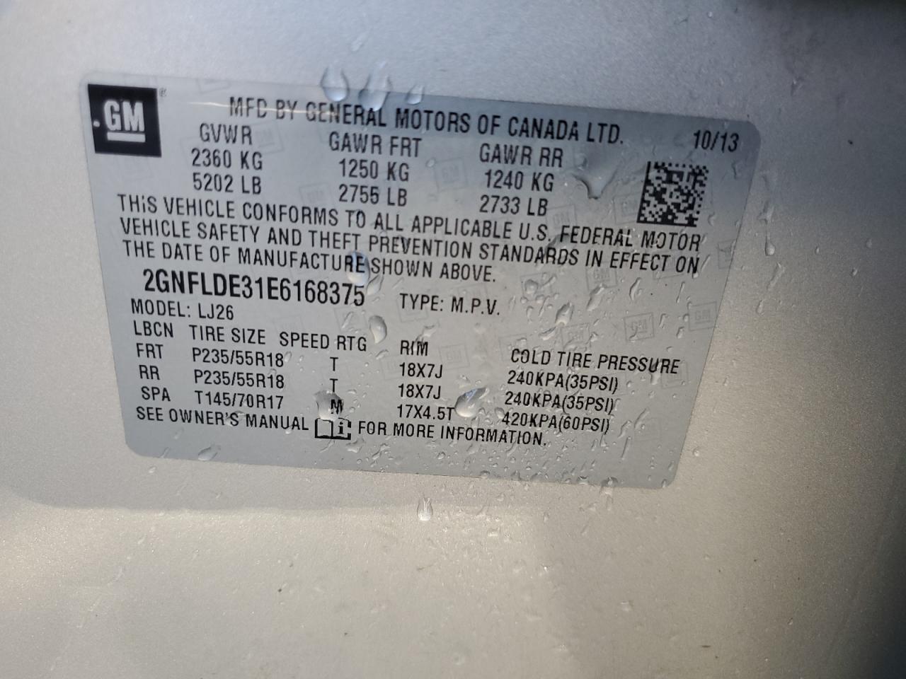 Колір ЗолотийЦиліндри 6VIN 2GNFLDE31E6168375Стан Заводиться та їде (перевірено)Ушкодження Передня або задня AutoRIA
