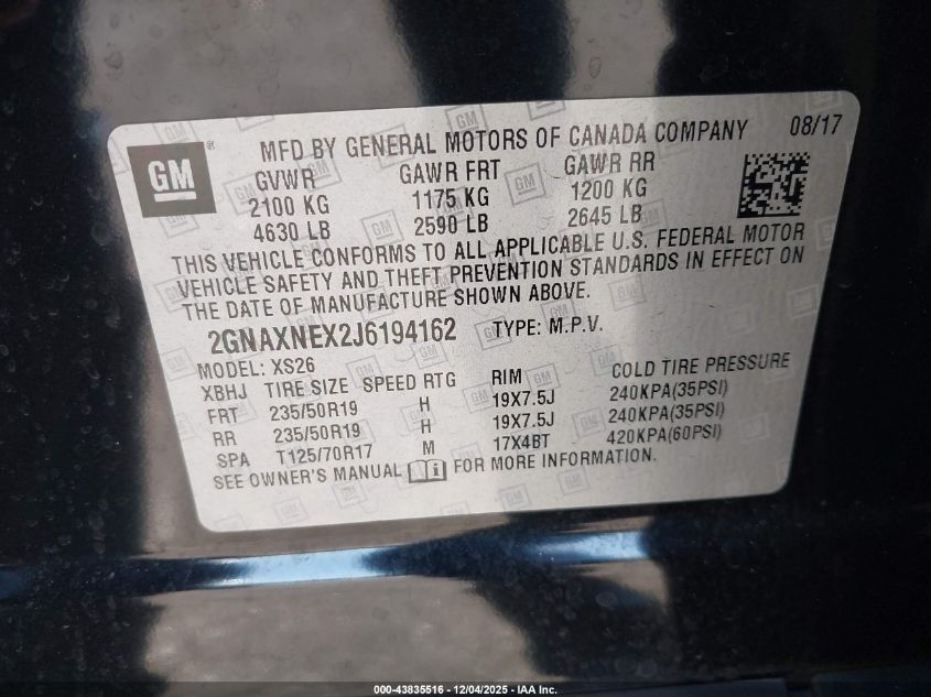 Колір ЧорнийЦиліндри 4Привід Передній привідVIN 2GNAXNEX2J6194162Стан Заводиться та їде (перевірено)Ушкодження Права сторонаДата аукціону 2025-12-12 AutoRIA