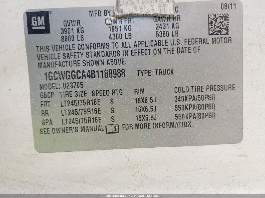 2011 CHEVROLET EXPRESS 2011 року Бензин, 4.8, Задній привід, vin - 1GCWGGCA4B1188988 з США