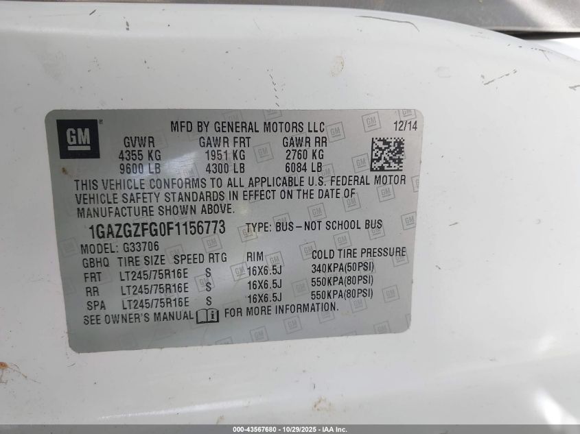 2015 CHEVROLET EXPRESS 2015 року Бензин, 6.0, Задній привід, vin - 1GAZGZFG0F1156773 з США
