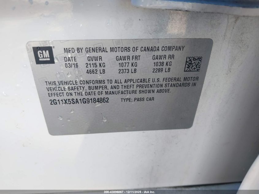 2016 CHEVROLET IMPALA 2016 року Бензин, 2.5, Передній привід, vin - 2G11X5SA1G9184862 з США