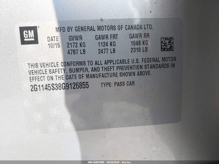 2016 CHEVROLET IMPALA 2016 року Бензин, 3.6, Передній привід, vin - 2G1145S38G9126855 з США