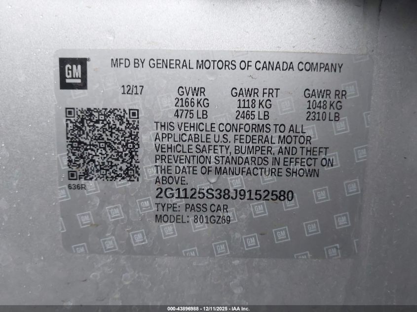 2018 CHEVROLET IMPALA 2018 року Бензин, 3.6, Передній привід, vin - 2G1125S38J9152580 з США