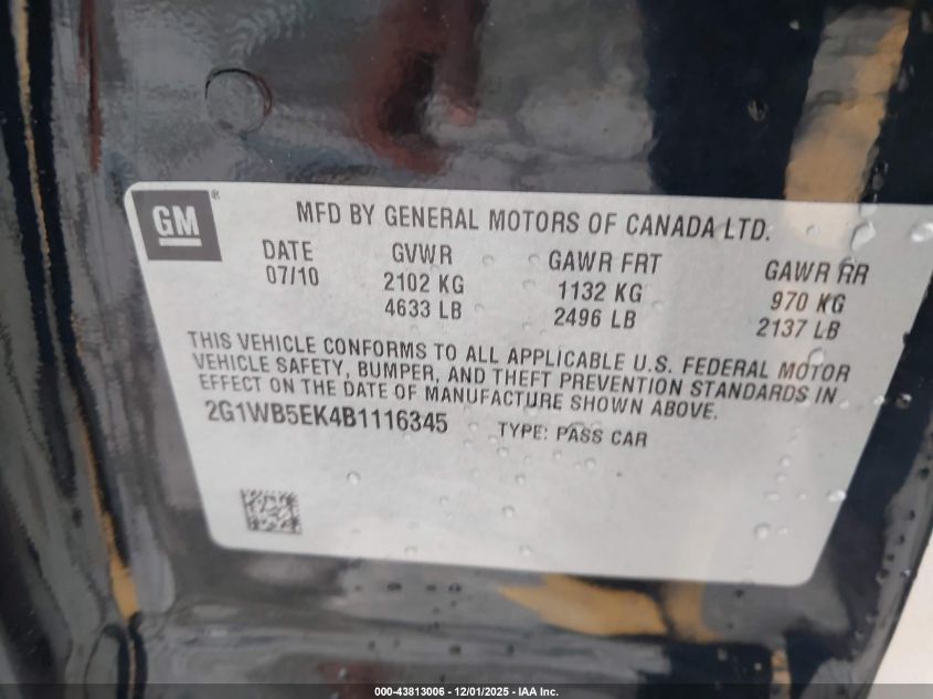 2011 CHEVROLET IMPALA 2011 року Бензин, 3.5, Передній привід, vin - 2G1WB5EK4B1116345 з США