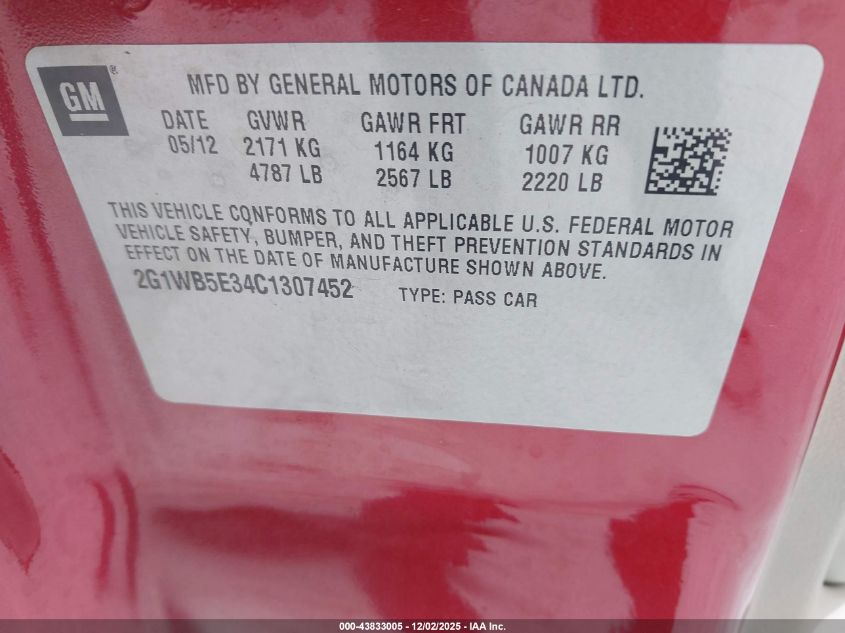 2012 CHEVROLET IMPALA 2012 року Бензин, 3.6, Передній привід, vin - 2G1WB5E34C1307452 з США