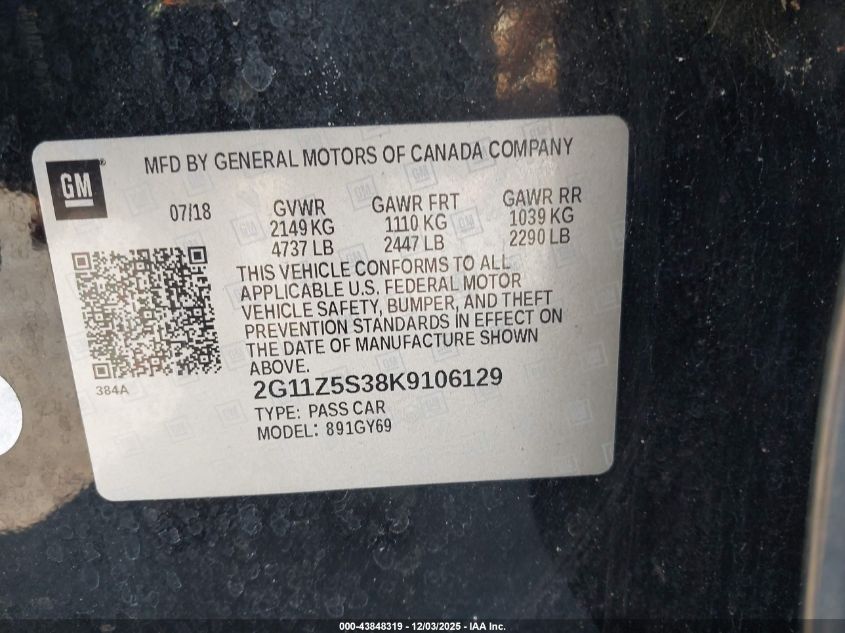 2019 CHEVROLET IMPALA 2019 року Бензин, 3.6, Передній привід, vin - 2G11Z5S38K9106129 з США